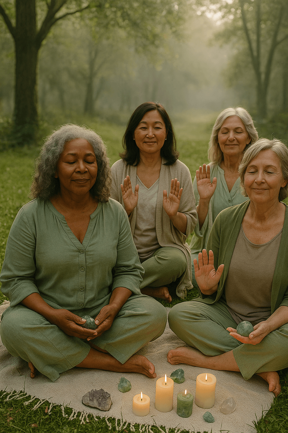 🌿 In the quiet of the forest, beneath the embrace of ancient trees and soft candlelight, four radiant women sit in sacred stillness.